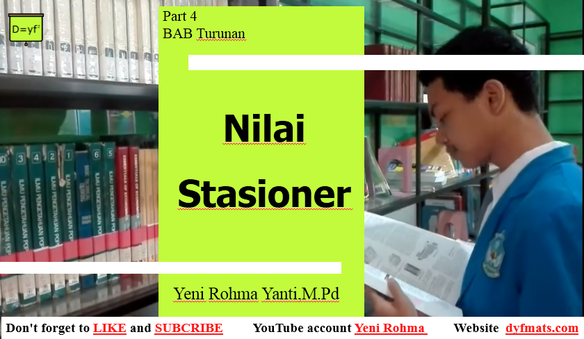 Nilai stasioner ditentukan dari uji turunan fungsi. Jika maka f(a) adalah nilai stasioner dari fungsi untuk .sedangkan titik dinamakan titik stasioner. simak video penjelasan berikut: